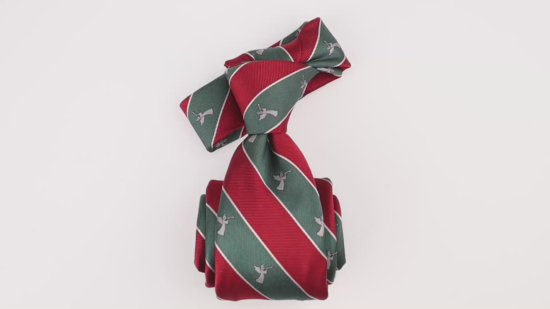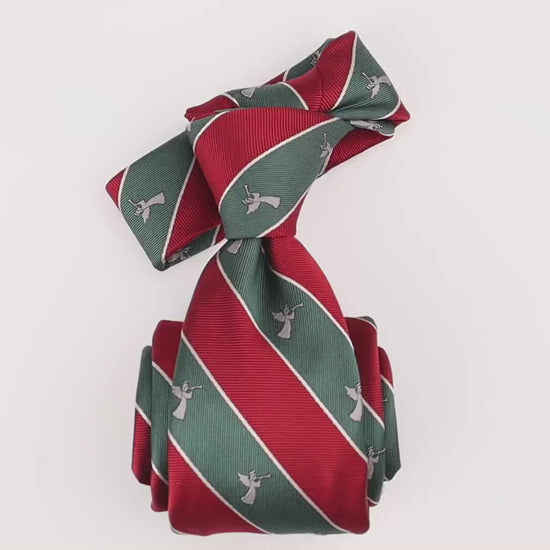 The woven motif on this mulberry silk necktie combines elegant red and green regimental stripes with a silver silhouette of an angel blowing a trumpet, echoing the heavenly messengers who proclaimed Christ's birth to the shepherds: "Glory to God in the highest" (Luke 2:13-14). This symbol represents divine announcement, the joy of the Incarnation, and the angelic role in heralding salvation, as celebrated in the Christmas liturgy and hymns like "Hark! The Herald Angels Sing."
