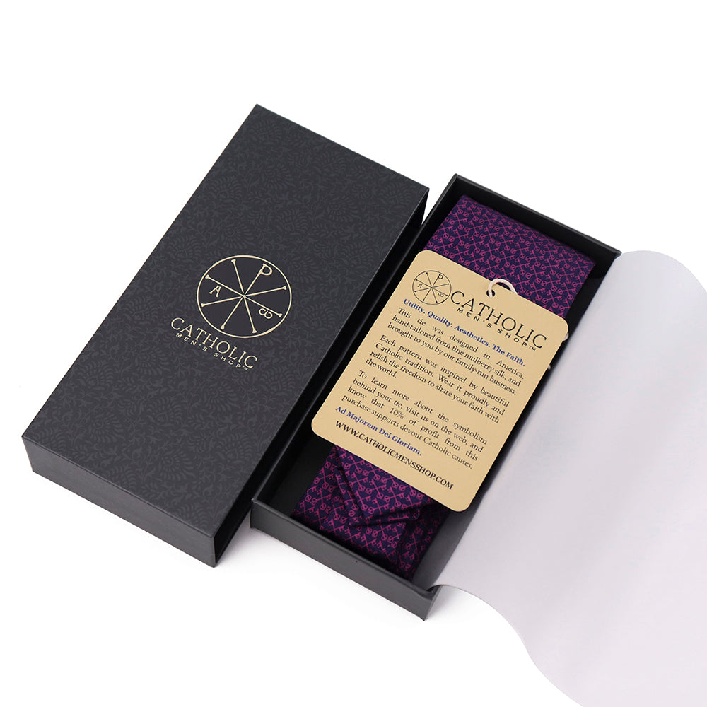 The micro pattern on this mulberry silk necktie repeats the crossed Keys of St. Peter, conferred by Christ upon the Apostle as the rock of His Church (Matthew 16:18-19). These keys denote the power to bind and loose in heaven and on earth—encompassing Church governance, sin forgiveness in the sacraments, and doctrinal safeguarding—passed to Peter and his papal successors as the visible unity of the faithful.